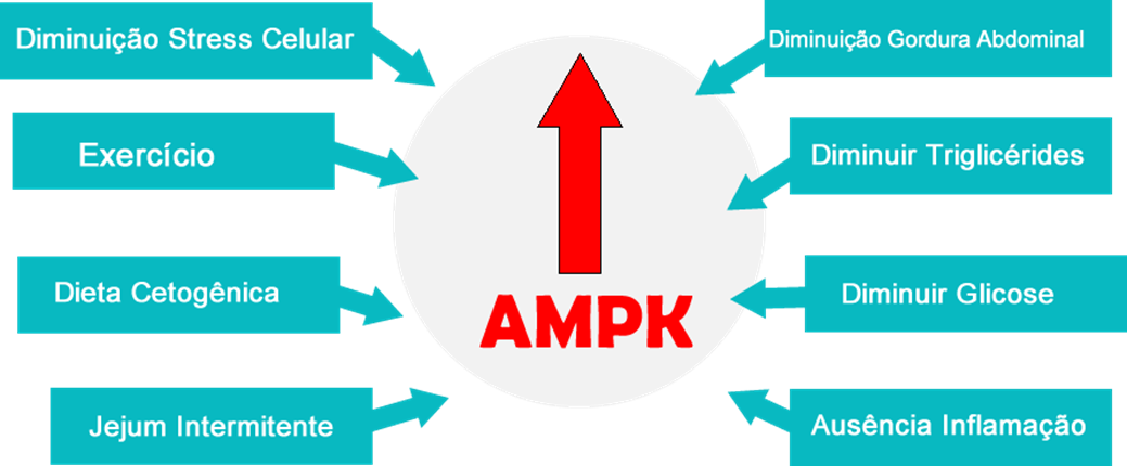 “A AMPK está envolvida na redução do armazenamento de gordura, regula a captação de glicose, cria novas mitocôndrias, elimina o lixo celular que se acumula dentro das células.”