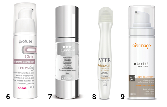 1. Blancy, Mantecorp Skincare, R$ 83*. Potente, é um gel-creme clareador para ser utilizado à noite. Tem um complexo despigmentante exclusivo, que associa ácido kójico, Sepiwhite, alfa-arbutin e achromaxyl.