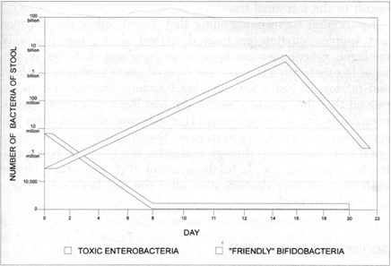 O gráfico a seguir mostra o crescimento das bactérias benéficas em um grupo de idosos que receberam suplementação de FOS durante 22 dias. (Jeffrey Bland PH.D, 1997)